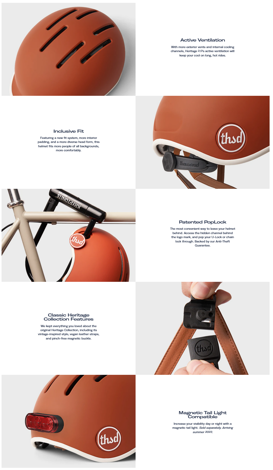 With more ventilation for cooler riding, an integrated magnetic tail light option for increased safety, and a more comfortable design to fit more riders of all backgrounds, Heritage 2.0 is the next generation of Thousand’s classic helmet collection.